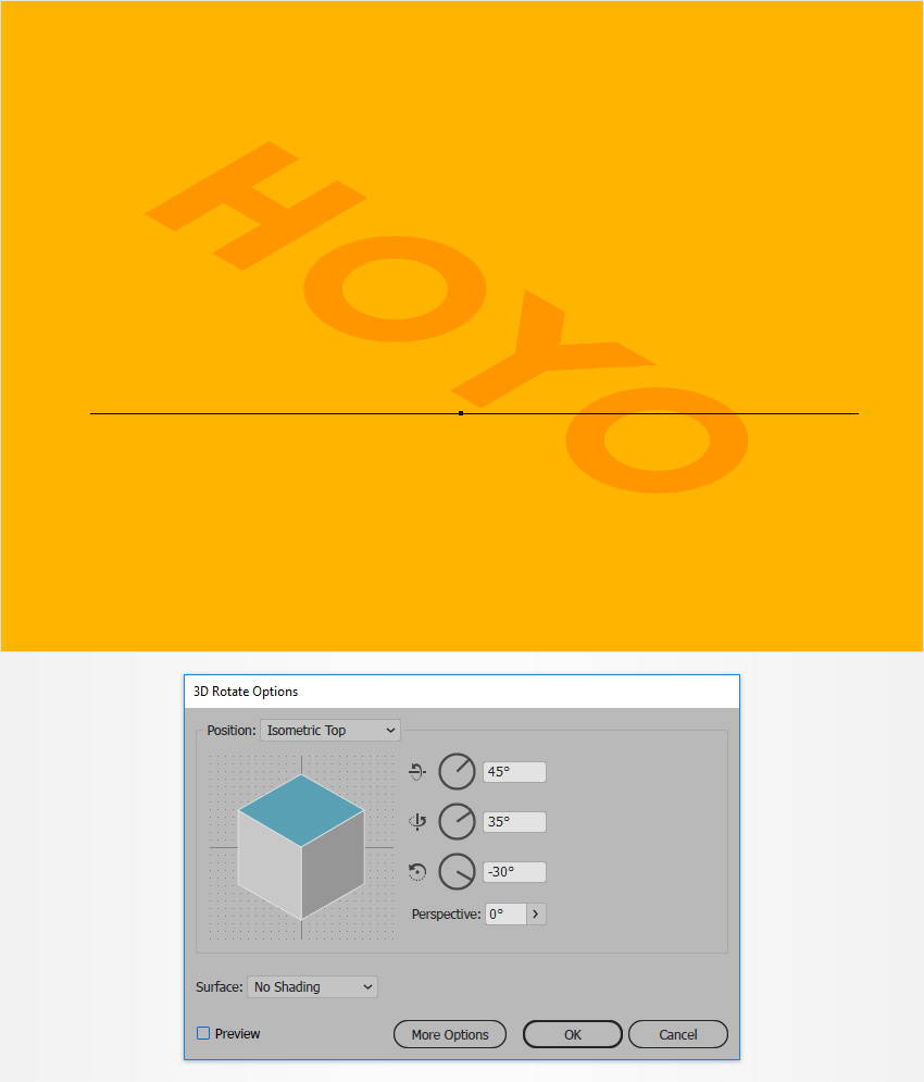 Убедитесь, что текст выделен и выберите в меню Effect > 3D > Rotate/Эффект>3D>Поворот. Введите параметры как показано ниже и нажмите OK.