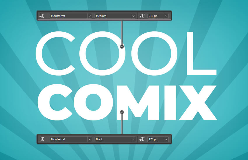 При помощи инструмента Type/Текст (T) введите ваш текст. В нашем случае это слово «COOL». Укажите тексту шрифт Montserrat Medium размером 212 pt. Затем в новом слое добавьте еще одно слово. В нашем случае это «COMIX». Укажите слову шрифт Montserrat Black и размер 170 pt.