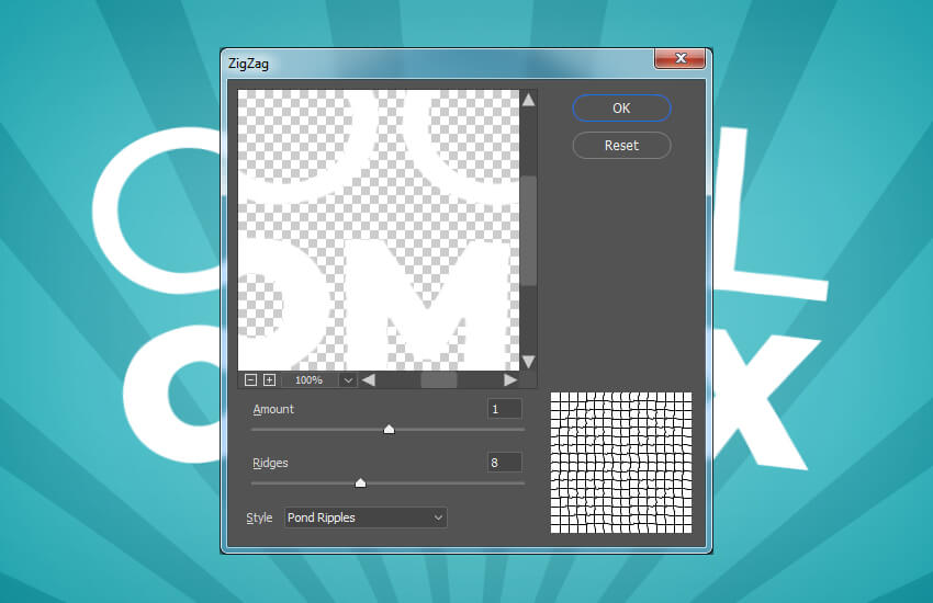 Теперь в меню выберите Filter > Distort > ZigZag/Фильтр>Искажение>Зигзаг и настройте параметры как показано ниже.