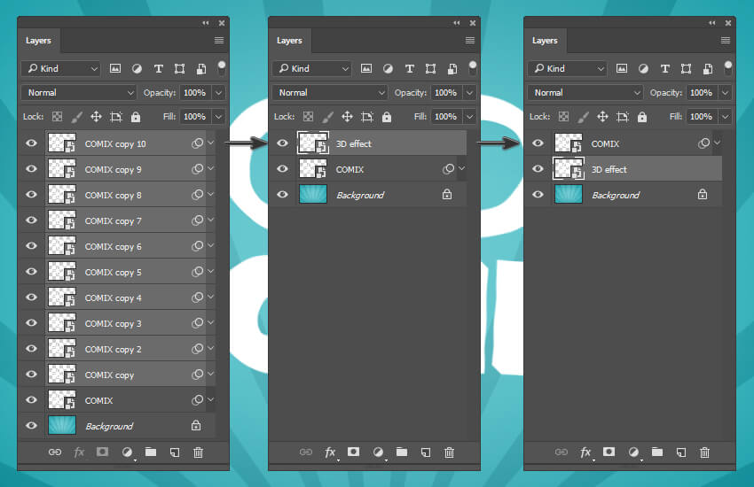 Выделите все дублированные слои в палитре Layers/Слои и в меню выберите Layer > Smart Objects > Convert to Smart Object/Слой>Смарт-объект>Конвертировать в смарт-объект. Укажите получившемуся смарт-объекту имя 3D effect и выберите в меню to Layer > Arrange > Send Backward/Слой>Упорядочить>Послать назад.