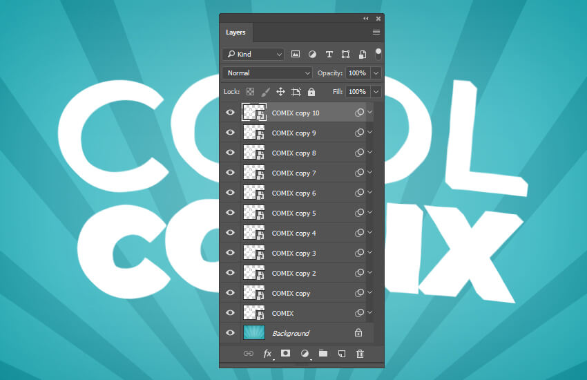 Эффект объема создадим при помощи дублирования слоев. Чтобы дублировать слой нажмите Control-J. Затем при помощи стрелок на клавиатуре переместите на один клик дублированный слой вниз и вправо. Повторите процесс, чтобы создать десять копий.