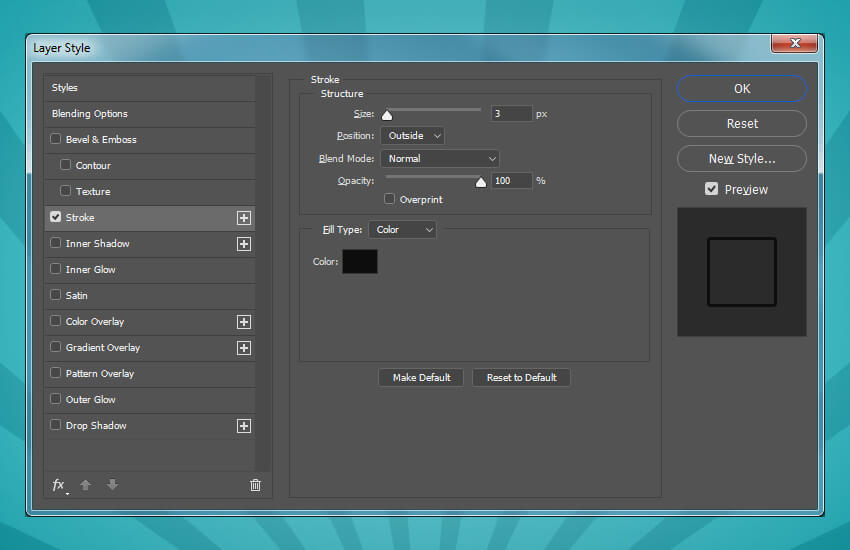 Добавьте стиль слоя Stroke/Обводка с параметрами как показано ниже. Используйте цвет #0d0d0d.