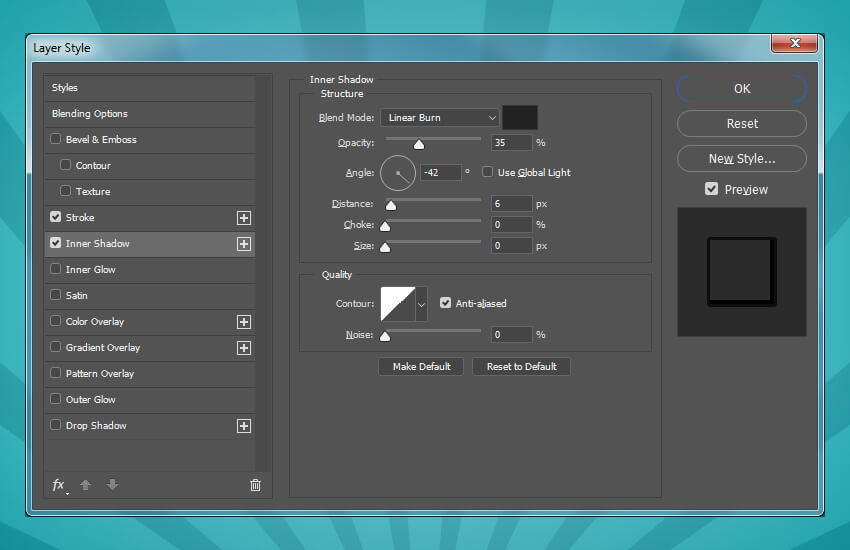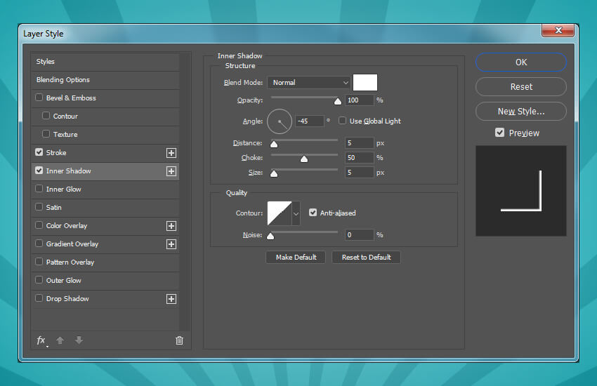 Добавьте стиль слоя Inner Shadow/Внутренняя тень с параметрами как показано ниже.