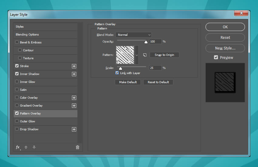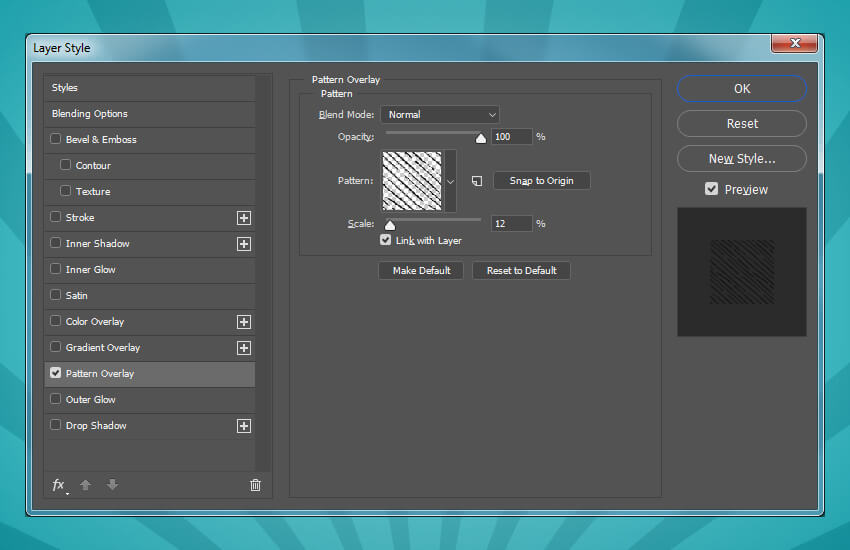 Добавляем стиль слоя Pattern Overlay/Перекрытие паттерна. Используйте паттерн cb-lines-1 и параметры как показано ниже.