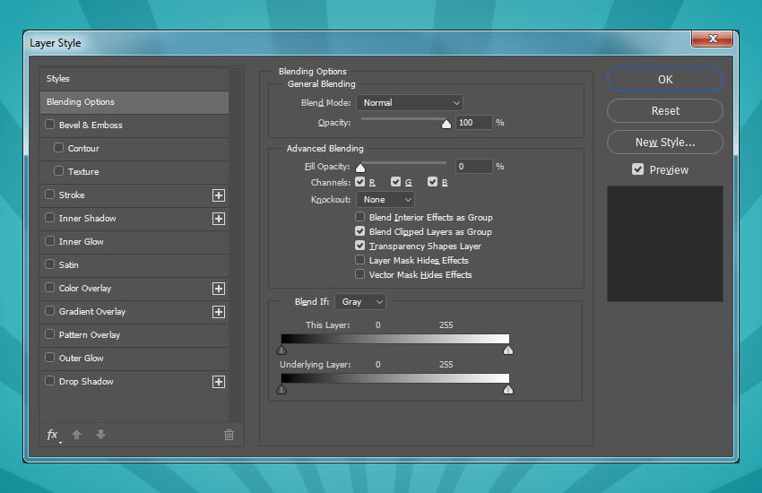 Выберите слой «3D effect» и в меню найдите Layer > Layer Style > Blending Options/Слой>Стиль слоя>Параметры наложения и примените следующие параметры: