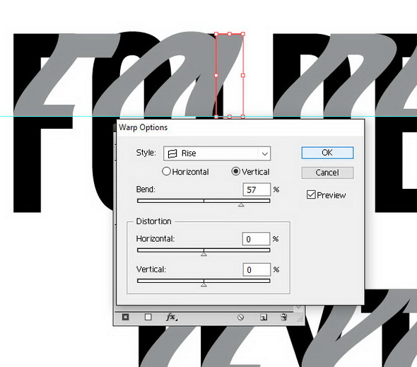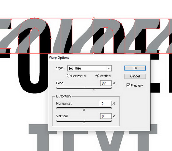 Выделите верхушки всех букв и примените Effect > Warp > Rise / Эффект > Деформация > Подъем. Нажмите на Vertical / Вертикально и измените значение на 35-40%.