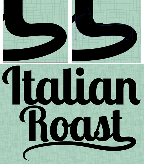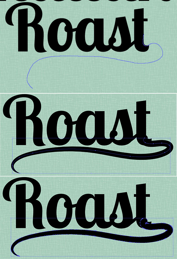 Если хотите, можете добавить нижнему слову хвостик. Используя инструмент Pencil/Карандаш (N) нарисуйте кривую от последней буквы, как показано ниже. Укажите кривой толстую Обводку/Stroke. Инструментом Width/Ширина (Shift – W) сузьте кончик кривой. Вновь Expand/Разберите вашу кривую, выбрав этот пункт в меню Object/Объект и Group/Сгруппируйте ваше последнее слово и кривую.