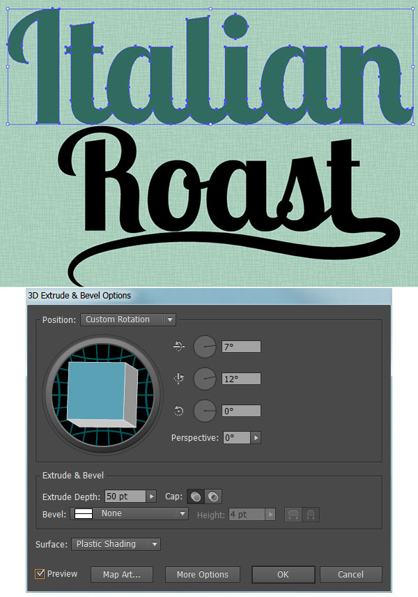 Выделите первое слово вашего текста и объедините все составляющие его контуры, нажав на иконку Unite/Объединить в палитре Pathfinder/Обработка контуров. Не снимая выделения с только что созданного контура выберите в меню Effect > 3D > Extrude & Bevel/Эффект>3D>Вытягивание и скос. Укажите в настройках следующие параметры: