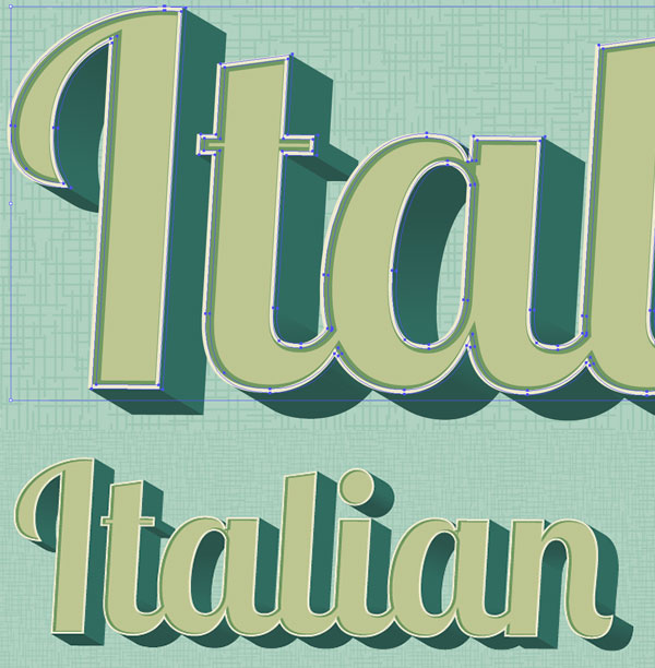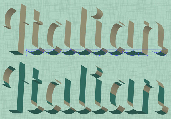 Нам понадобятся два цвета, чтобы раскрасить 3D-составляющие нашего текста. В нашем примере будут использованы бирюзовый и темно-бирюзовый. Используя инструмент Direct Selection/Прямое выделение (A), выделите нижние части 3D-составляющих букв (ориентируйтесь на картинку ниже). Укажите им темно-бирюзовый цвет. Укажите бирюзовый цвет всем частям 3D-составляющих, которые находятся справа от букв, но не являются частью сгибов.