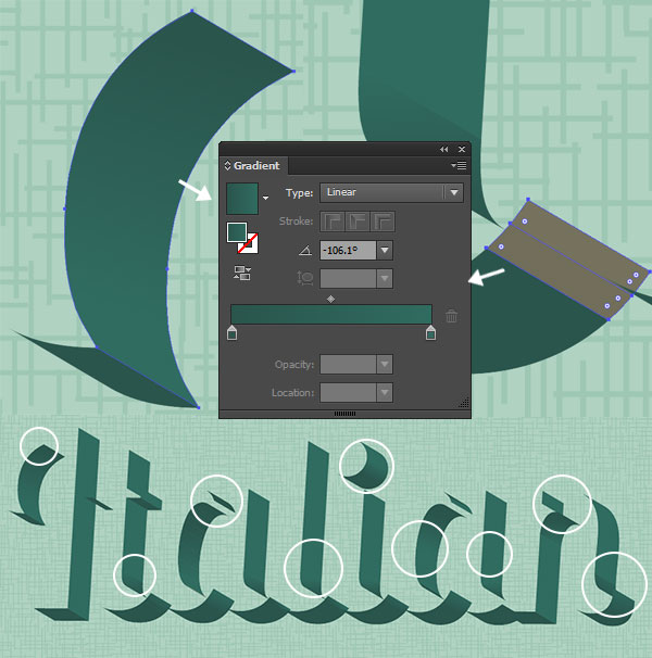 Для частей, которые находятся на сгибе примените Linear Gradient/Линейный градиент от бирюзового к темно-бирюзовому. Вы можете настроить его в палитре Gradient/Градиент. Также экспериментируйте и настраивайте угол градиента.