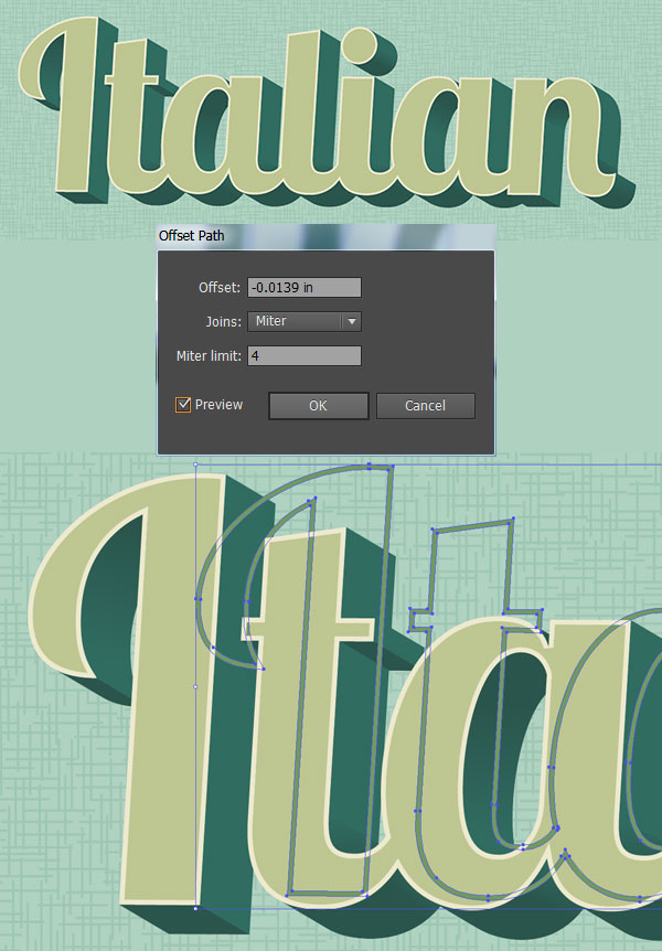 Выделите лицевую часть вашего текста (группу из шага 5), Copy/Копируйте (Control – C), Paste/Вставьте (Control – V), и в меню выберите Object > Path > Offset Path/Объект>Контур>Параллельный контур укажите Offset/Смещение в -1px . Выделите обе копии текста и в палитре Pathfinder/Обработка контура нажмите на иконку Minus Front/Минус верхний. Укажите получившейся фигуре еще более светлый цвет заливки. Copy/Скопируйте и Paste/Вставьте последнюю фигуру и укажите ей цвет более темный, чем цвет текста.