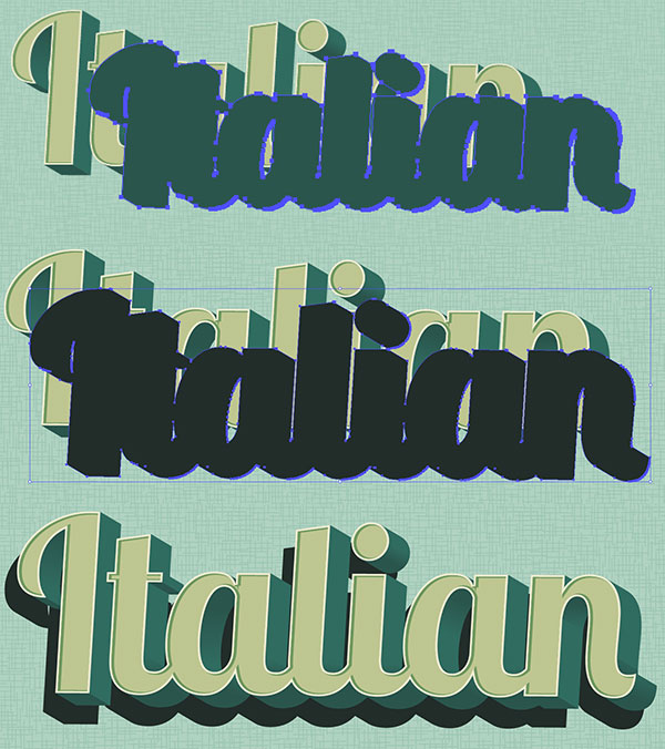 Group/Сгруппируйте всю строчку текста. Copy/Копируйте ее и Paste/Вставьте. Unite/Объедините дублированный текст в палитре Pathfinder/Обработка контура. Укажите получившейся фигуре еще более темный цвет заливки и поместите ее на самый задний план в палитре Layers/Слои. Переместите фигуру вниз и влево, как показано на картинке ниже.