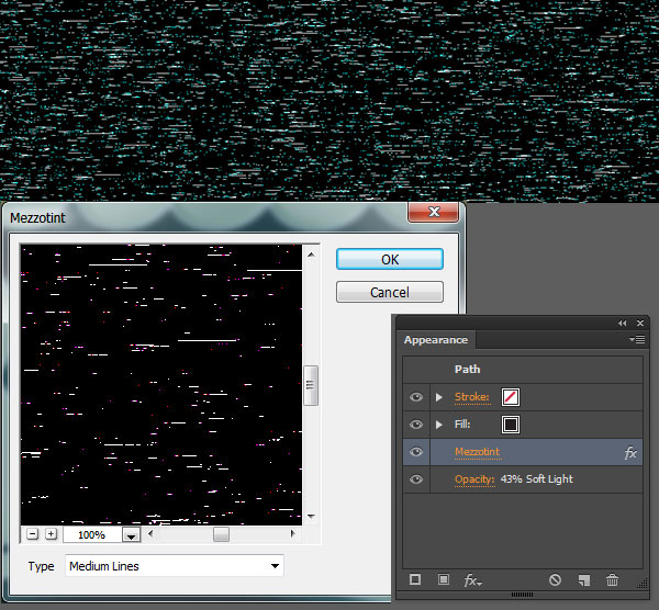 Чтобы создать текстуру Copy/Копируйте и Paste/Вставьте фигуру фона. Поместите его поверх всех остальных слое в палитре Layers/Слои. Укажите цвет заливки темно-серый и в меню выберите Effect > Pixelate > Mezzotint/Эффект>Оформление>Меццо-тинто. Настройте эффект как показано ниже. В палитре Transparency/Прозрачность укажите Blend Mode/Режим наложения Soft Light/Мягкий свет и Opacity/Непрозрачность в 43%.