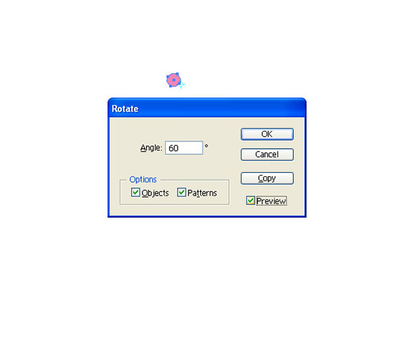 Выберите инструмент Вращение Rotation Tool ®,  и удерживая Alt / Option. В окне, которое появится  установите значение угла в 60 °, а затем нажмите кнопку Копировать. Это позволит создать второй розовый круг.