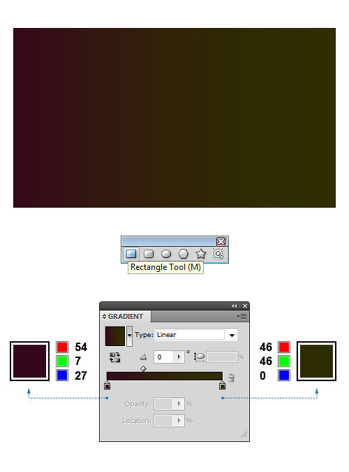 Создайте новый документ и задайте размеры 900 x 500 px. Выберите в меню инструмент Rectangle / Прямоугольник и нарисуйте прямоугольник шириной 900, высотой 500. Теперь выберите панель Gradient / Градиент и залейте этот прямоугольник линейным градиентом как показано ниже: