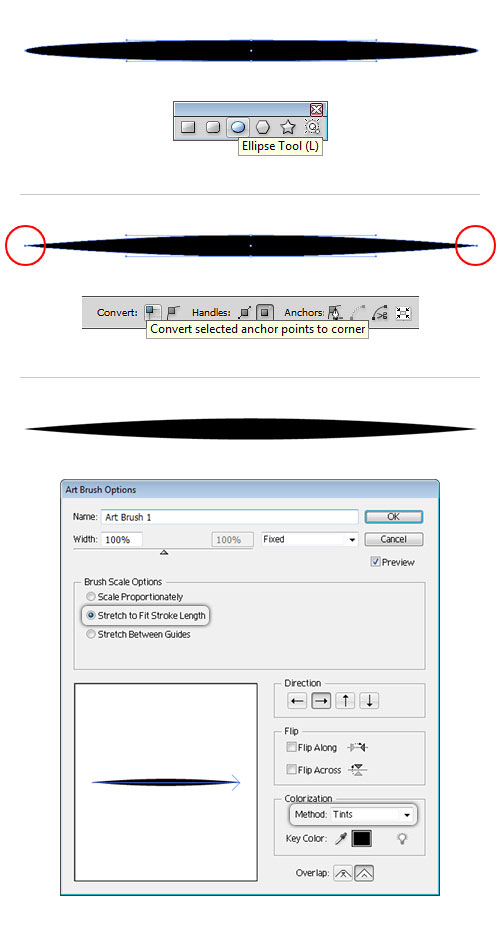 Возьмите инструмент Ellipse / Эллипс и нарисуйте сильно вытянутый овал размером 150 x 7 px. Когда закончите, воспользуйтесь Direct Selection Tool / Прямое Выделение и выделите крайнюю правую и левую точки своего эллипса как показано на скриншоте ниже. Нажмите Convert selected anchor points to corner / Преобразовать опорную точку в угол.