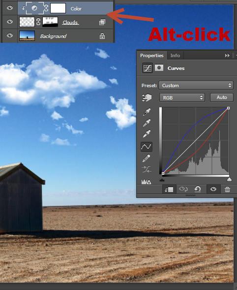 Теперь, удерживая Alt, кликните между слоями корректирующего слоя и слоя с облаками. Таким образом вы укажите корректирующему слою обтравочную маску по слою с облаками (в итоге эффект буден виден только на облаках).