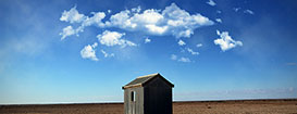 Укажите этому слою маску (Layer > Layer Mask > Reveal All/Слой>Слой-маска>Показать все) и черным цветом скройте нижнюю часть слоя — ту, где облака накладываются на землю и дом, а также некоторые области в верхней части.