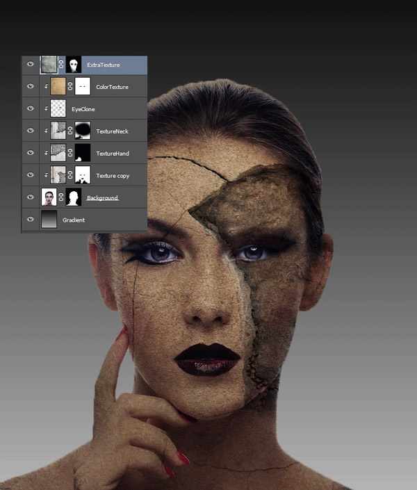 Смените blending mode/режим наложения слоя на Multiply/Умножение. Укажите слою маску и кистью черного цвета в маске закрасьте область глаз, чтобы сделать текстуру невидимой в этой части документа.