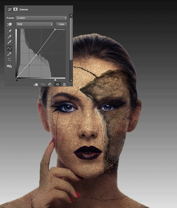 Создайте корректирующий слой кривых ( Layer > New Adjustment layer > Curves/ Слой>Новый корректирующий слой> Кривые). Настройте кривые как показано ниже, чтобы увеличить контраст и яркость.