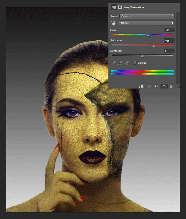 Создайте корректирующий слой Цветовой тон/Насыщенность (Layer > New Adjustment Layer > Hue/Saturation/Слой>Новый корректирующий слой >Цветовой тон/Насыщенность) и укажите следующие параметры: