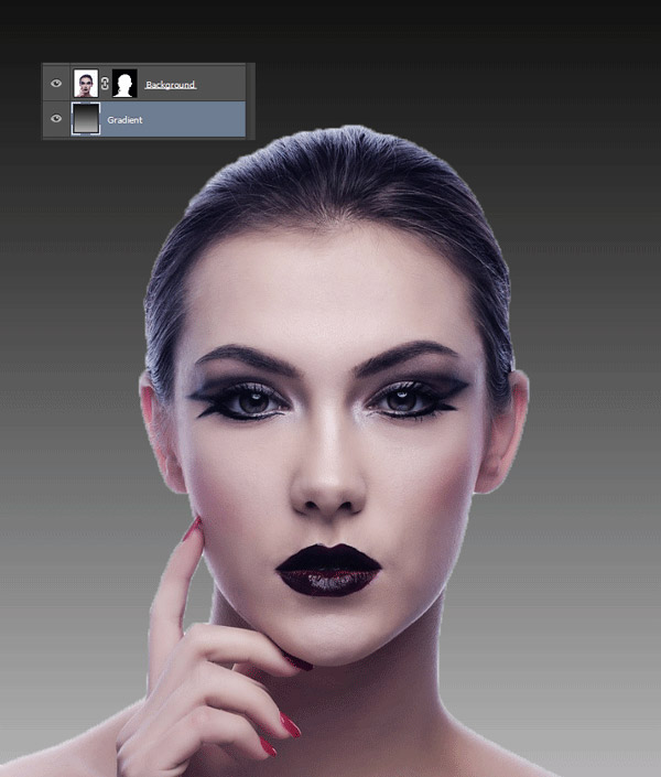 Создайте новый слой (Ctrl + Shift + Alt + N) и перетащите его под слой с девушкой. Возьмите инструмент Gradient/Градиент и залейте фон градиентом от черного цвета к белому. Удерживайте клавишу Shift, чтобы градиент растянулся идеально вертикально.