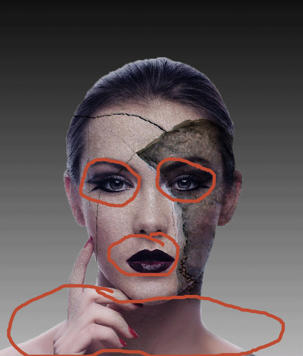 Укажите слою с текстурой 1 маску (Layer > Layer Mask > Reveal All/Слой>Маска слоя>Показать все). Возьмите растушеванную кисть черного цвета и в маске закрасьте ею область глаз, рта и шеи, тем самым маскируя в этом месте слой с текстурой.