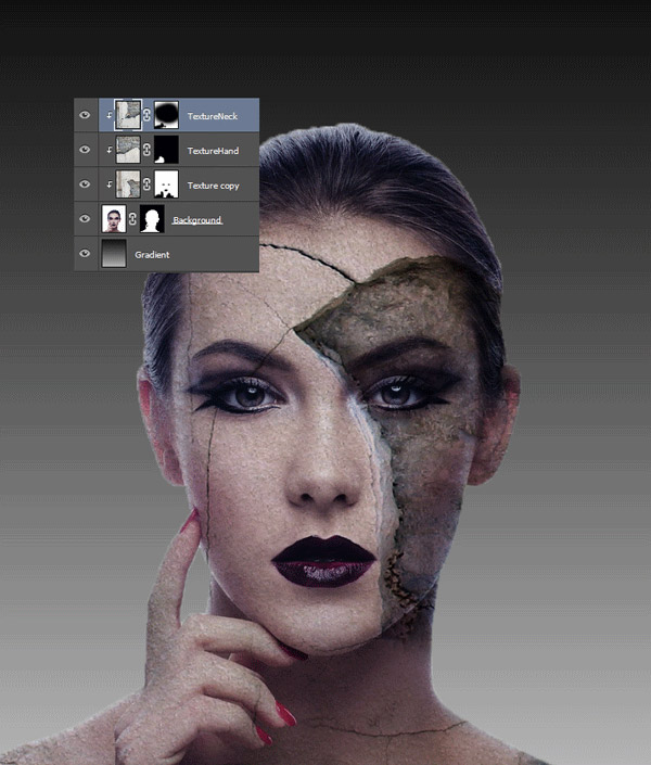 Вновь дублируйте текстуру и на этот раз переместите копию правее и выше. В маске слоя сделайте видимой только нижнюю область над нижней частью шеи. Для этого залейте всю маску черным цветом, а белой растушеванной кистью рисуйте поверх места, которые хотите сделать видимыми.