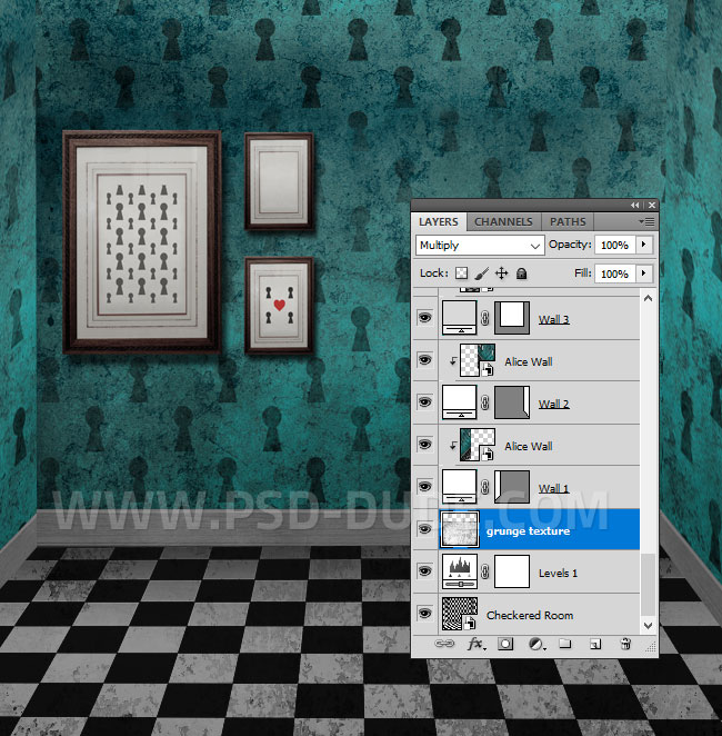 Создайте новый слой над слоем Levels/Уровни. Добавьте в него гранж-текстуру и укажите ей режим наложения Multiply/Умножение.