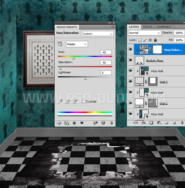 Укажите слою с дырой (Broken Floor) корректирующий слой Hue/Saturation/Цветовой тон/Насыщенность. Чтобы коррактирующий слой действовал только на один слой, сделайте его обтравочной маской этого слоя.