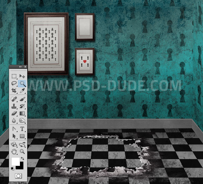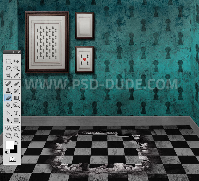 Чтобы создать дыру в полу, поместите в наш документ изображение разбитой стены. В меню выберите Edit > Transform > Distort/Редактировать>Трансформировать>Исказить и измените перспективу.