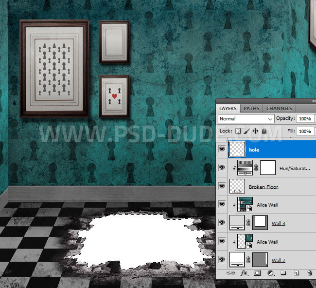 Над слоем Hole поместите текстуру Alice Keyhole и сделайте этот слой обтравочной маской для слоя под ним.