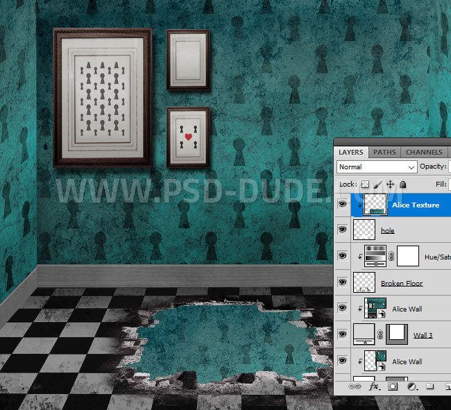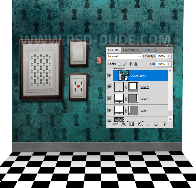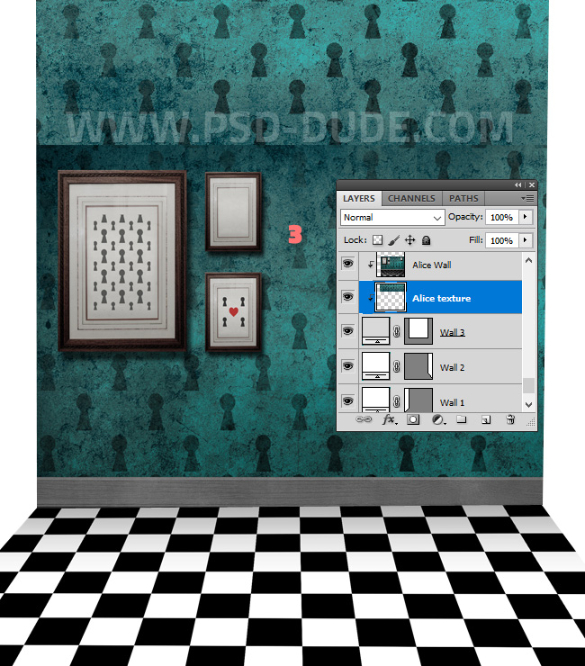 Чтобы добавить стене высоты используйте текстуру Alice in Wonderland. Она повторяет узор на стене. Поместите текстуру между слоями Wall 1 и Alice Wall.
