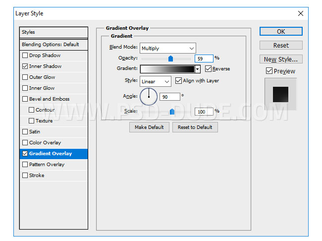 Кликните дважды по слою Hole чтобы указать ему стили слоя: Inner Shadow/Внутренняя тень и Gradient Overlay/Перекрытие градиента.