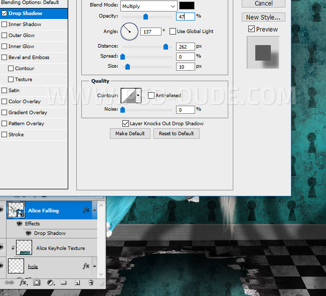Так как источник света находится вверху, добавьте слою с Алисой стиль слоя Drop Shadow/Тень. Нам нужно создать эффект отбрасывания тени.