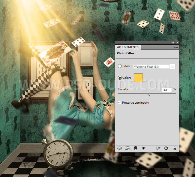 Также добавьте корректирующий слой Photo Filter/Фотофильтр, используя теплый цвет #ffcf4f.