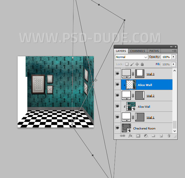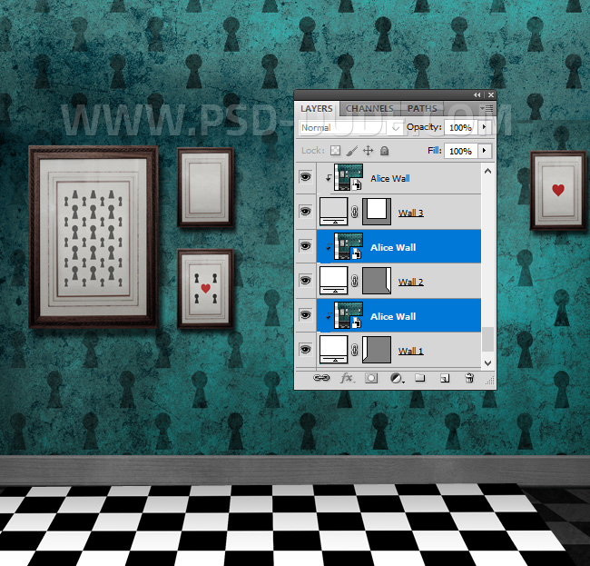 Добавьте фон Аlice Room в новый слой над слоем Wall 1. Кликните по нему правой кнопкой и выберите Create Clipping Mask/Создать обтравочную маску. Назовите слой Alice Wall.