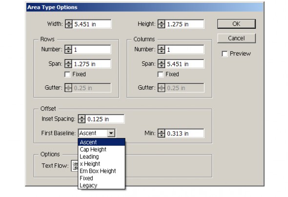 По умолчанию текст в контейнере начинается сверху. Если вы хотите начать текст выше или ниже рамки, параметр Первая базовая линия/First Baseline дает вам такую возможность. После того как вы выбрали опцию размещения первой строки, параметр Мин/Min поможет вам отрегулировать смещение первой строки относительно верхнего края.