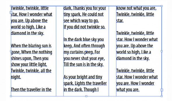 После того как вы ввели желаемые параметры, нажмите OK. Теперь вы можете ввести текст в область и посмотреть как он распределился по указанным вами колонкам. Если вы не довольны результатом, вернитесь в опции инструмента Текст в области/Area Type и укажите другие значения.