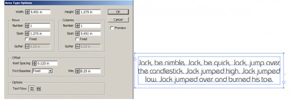 Инструмент Текст в области/Area Type обладает множеством полезных опций, которыми многие пренебрегают. Чтобы посмотреть настройки инструмента выберите в меню Текст>Параметры текста в области/Type > Area Type Options или кликните дважды по инструменту Текст в области/Area Type. Откроется окно опций. Здесь вы можете указать количество колонок и рядов, их ширину, направление текста и др.