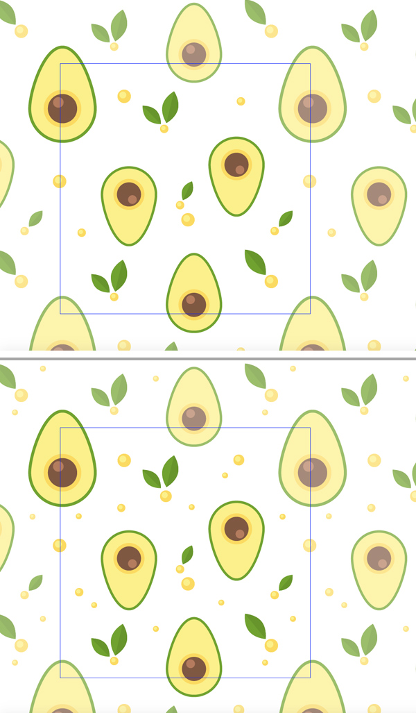 Дублируйте наш авокадо, изменяя его размеры, отражая его и располагая в разных частях узора. После того как вы будете довольны тем как расположены авокадо, добавляйте таким же способом ягодки с листиками. Старайтесь равномерно заполнить пустые места.
