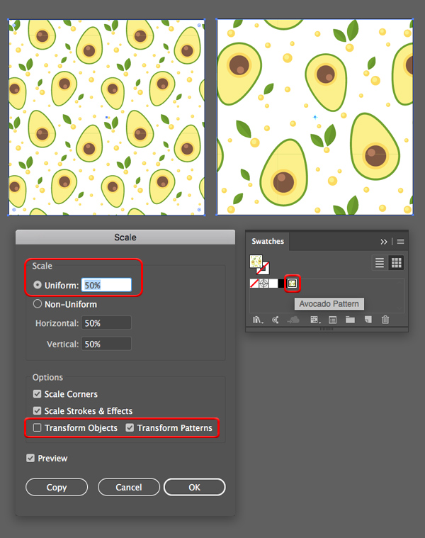 Создайте квадрат размером 600 x 600 px при помощи инструмента Rectangle/Прямоугольник (M) и укажите ему наш паттерн. Кликните дважды по инструменту Scale/Масштаб (S), чтобы открыть окно настроек. Укажите Uniform Scale/Равномерное масштабирование на 50%. Снимите галочку с пункта Transform Objects/Трансформировать объекты, чтобы масштабировать только паттерн.