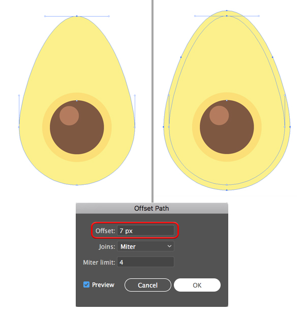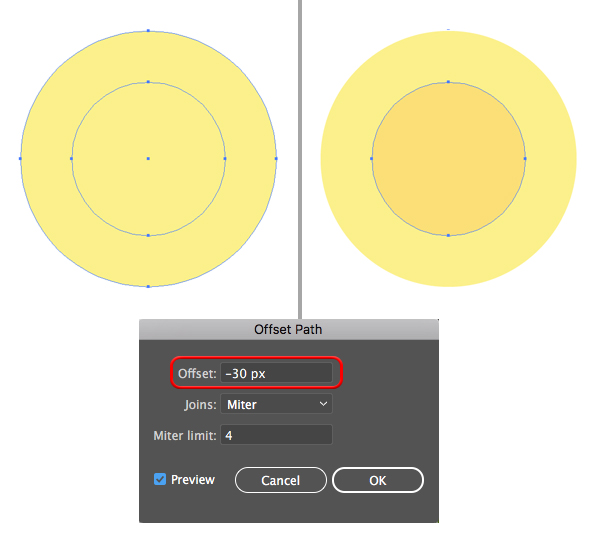 Не снимая выделение с круга, выберите в меню Object > Path > Offset Path/Объект>Контур>Создать параллельный контур и укажите отступ в -30 px, оставив остальные настройки по умолчанию. Нажмите OK.