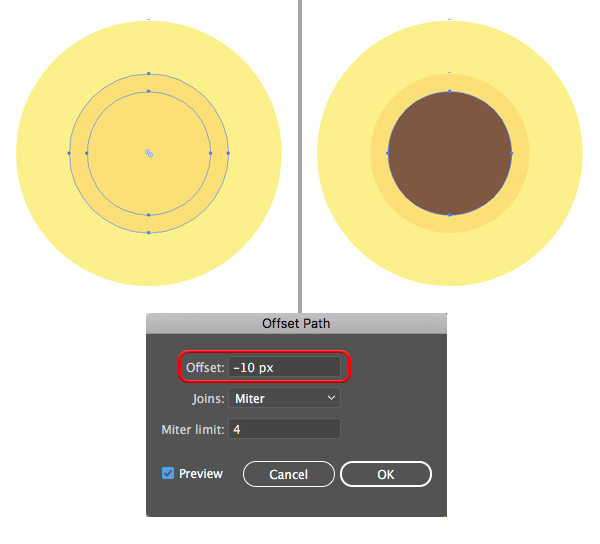 Выделите меньший круг и тем же способом создайте еще один Offset Path/Параллельный контур, на этот раз указав отступ в -10 px. Укажите новому кругу коричневый цвет заливки.
