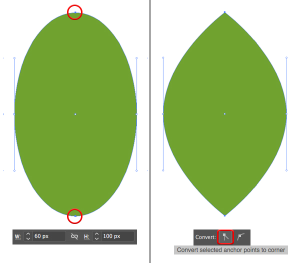 Выделите верхнюю и нижнюю точки овала инструментом Direct Selection/Прямое выделение (A) и в панели настроек кликните по иконке Convert selected anchor points to corner/Преобразовать выделенные опорные точки в углы.