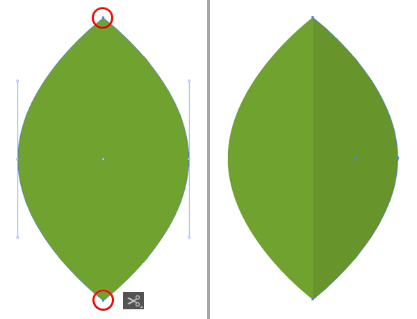 Возьмите инструмент Scissors/Ножницы © и кликните по верхней и нижней точкам листа. Укажите правой половинке более темный оттенок зеленого. Выделите обе половинки и нажмите Control-G, чтобы сгруппировать их.