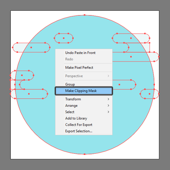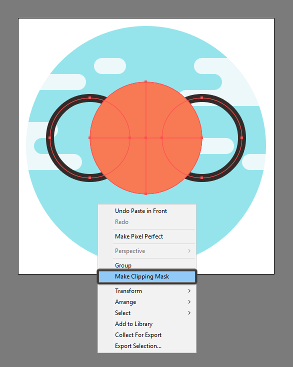 Мы хотим чтобы облака, которые мы нарисовали, были видны только внутри круга. Для этого нам нужно указать им маску. Выделите все облака и нажмите Control-G, чтобы сгруппировать их. Теперь выделите круг и копируйте его (Control-C), затем вставьте копию на передний план (Control-F). Не снимая выделения с круга нажмите Shift+ctrl+]. Так вы поместите круг на передний план. Выделите его и группу облаков, кликните по ним правой кнопкой и выберите Make Clipping Mask/Создать обтравочную маску. Выделите все что мы создали до этого момента и сгруппируйте (Control-G).