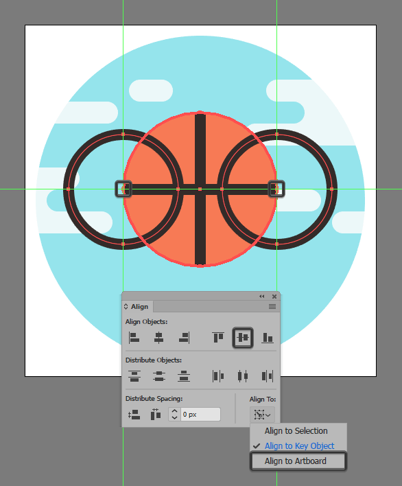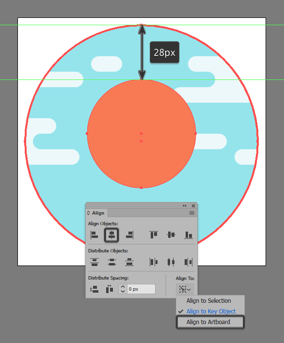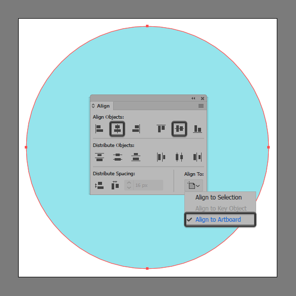 Теперь мы можем начать работу над иконкой. Инструментом Ellipse/Эллипс создайте круг размером 120 x 120 px и цветом заливки #96E5ED. В палитре Align/Выравнивание выберите Align to Artboard/Выравнивание относительно страницы, затем кликните по иконкам выравнивания по вертикальному и горизонтальному центрам.