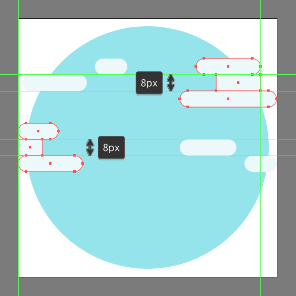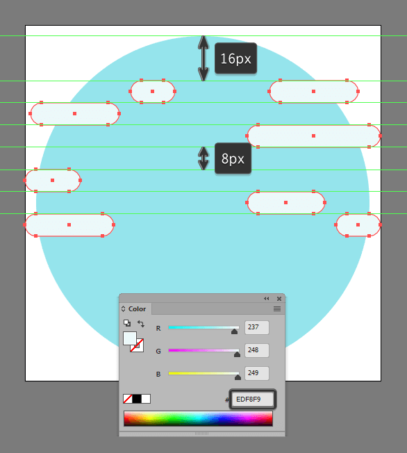 Инструментом Rectangle/Прямоугольник дорисуйте прямоугольники, соединяющие некоторые созданные в предыдущем шаге фигуры. Пусть они также будут высотой в 8 px и с тем же цветом обводки (#EDF8F9).