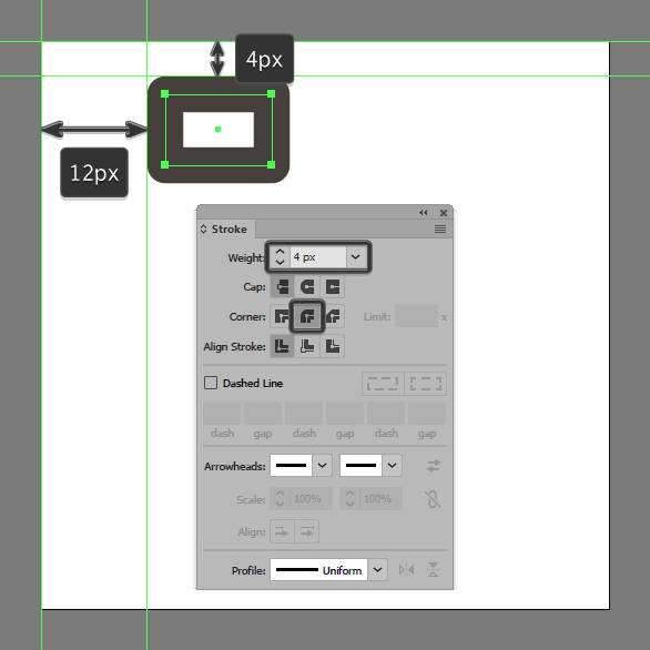 Начнем с прямоугольника размером 12 x 8 px. Укажите ему толщину обводки в 4 px в палитре Stroke/Обводка и цвет обводки #443D38. В той же палитре выберите режим закругленных углов. Поместите прямоугольник на холст как показано ниже.
